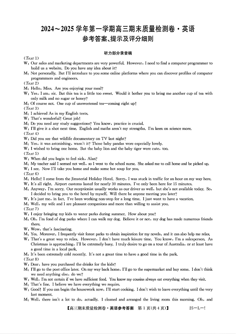 山西省三晋卓越联盟2025届高三上学期期末质量检测 英语答案.pdf