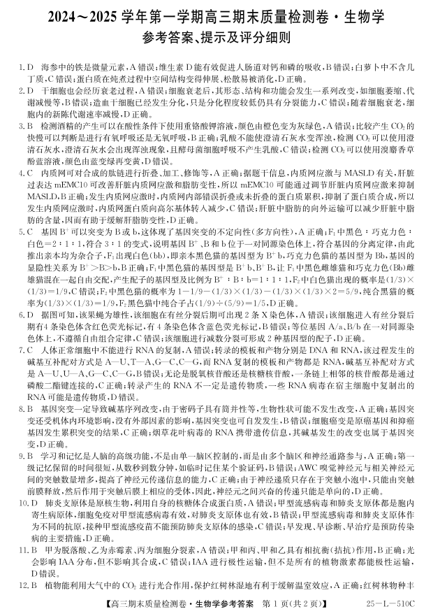 山西省三晋卓越联盟2025届高三上学期期末质量检测 生物答案.pdf