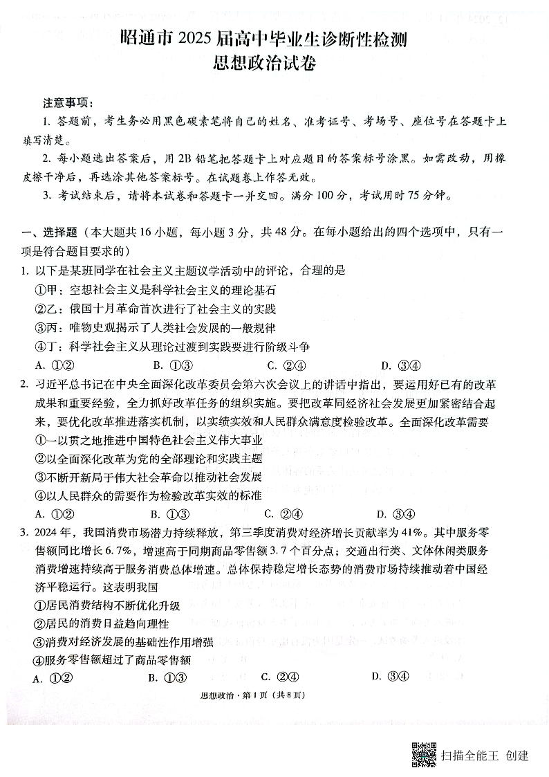 云南省昭通市2025届高三上学期1月诊断性检测 政治.pdf