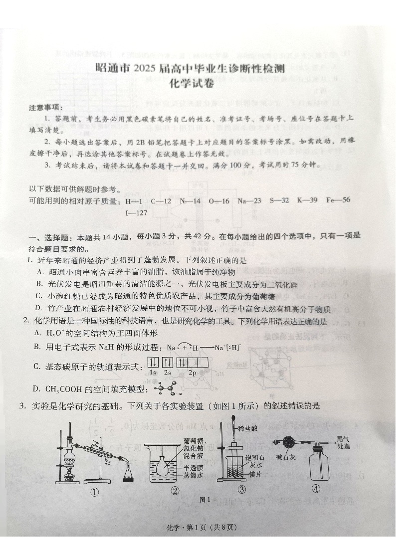 云南省昭通市2025届高三上学期1月诊断性检测 化学.pdf