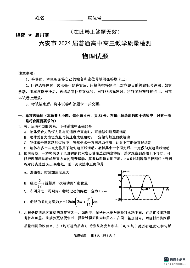 安徽省六安市2025届普通高中高三教学质量检测 物理.pdf