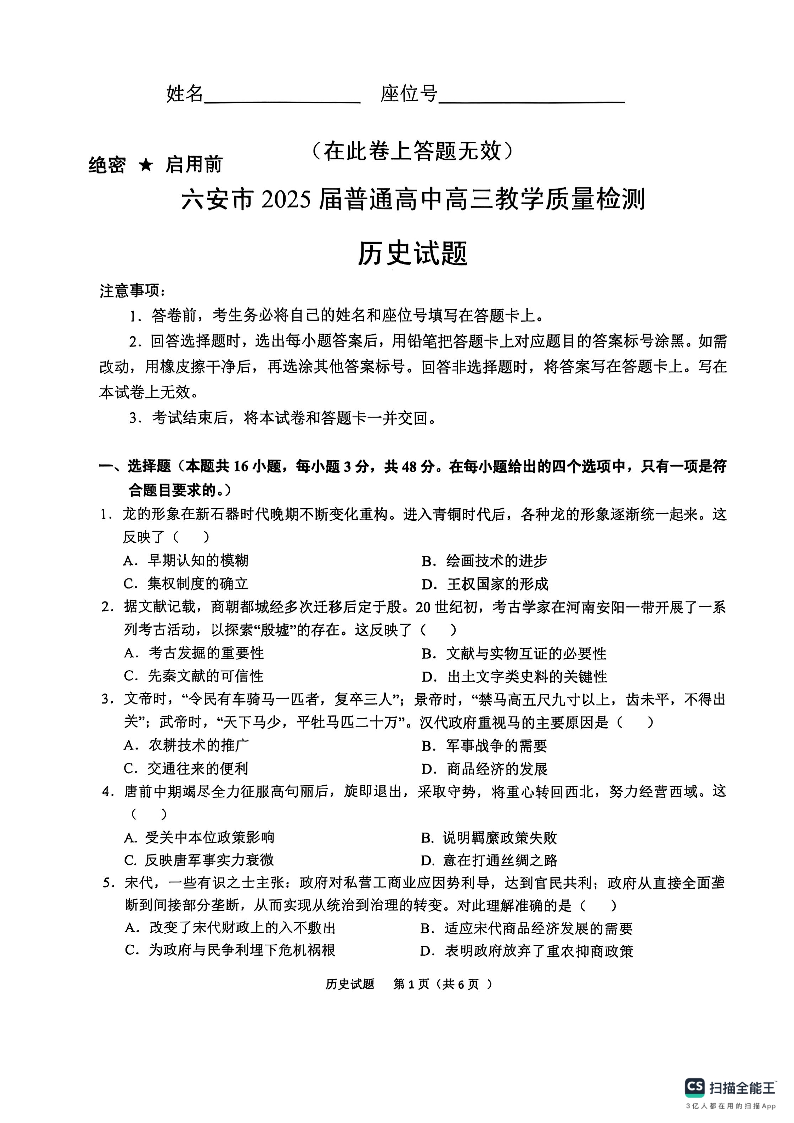 安徽省六安市2025届普通高中高三教学质量检测 历史.pdf