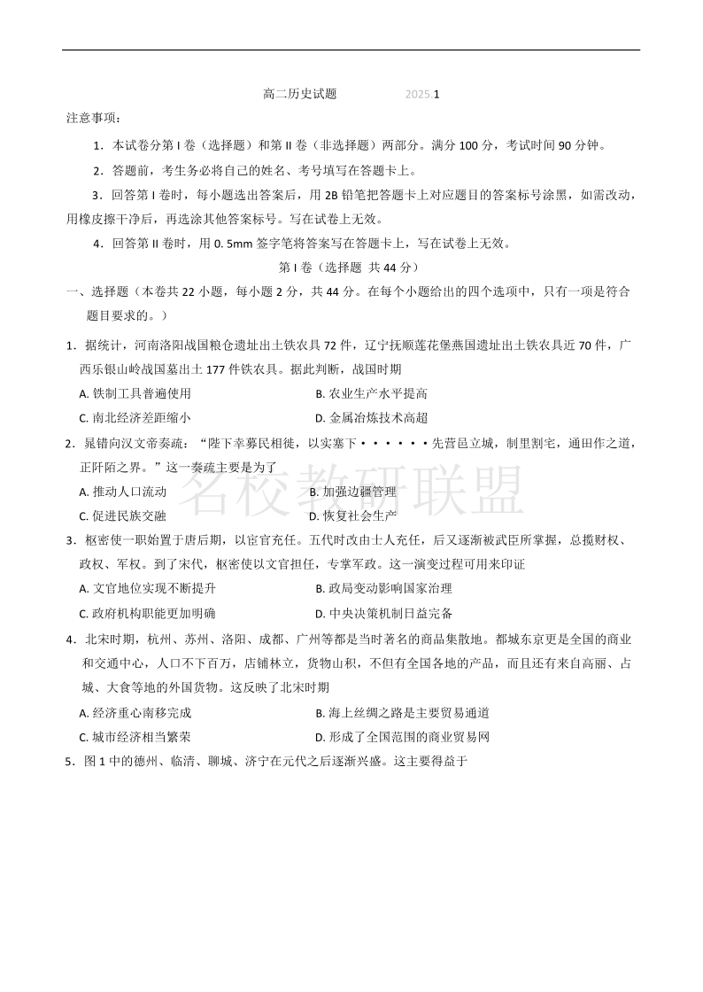 山东省滨州市2024-2025学年高二上学期期末考试 历史.pdf
