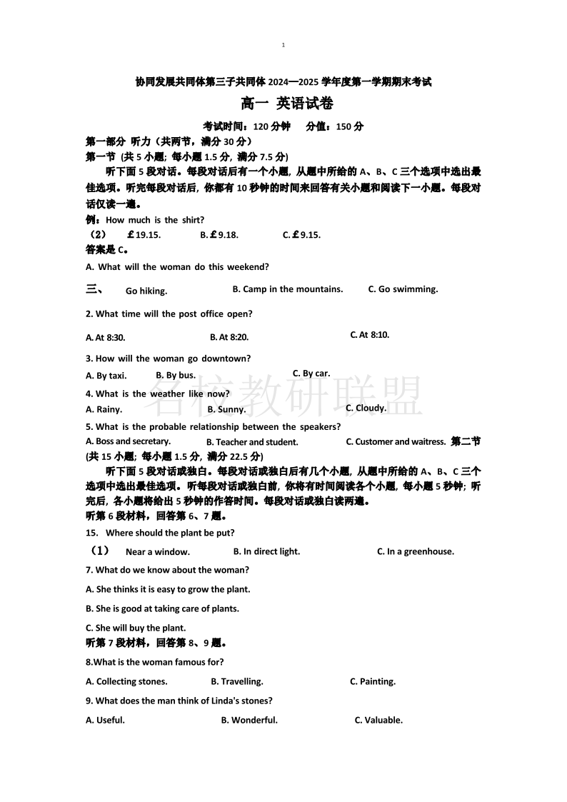 黑龙江省牡丹江市第三子共同体2024-2025学年高一上学期期末 英语(含答案).pdf