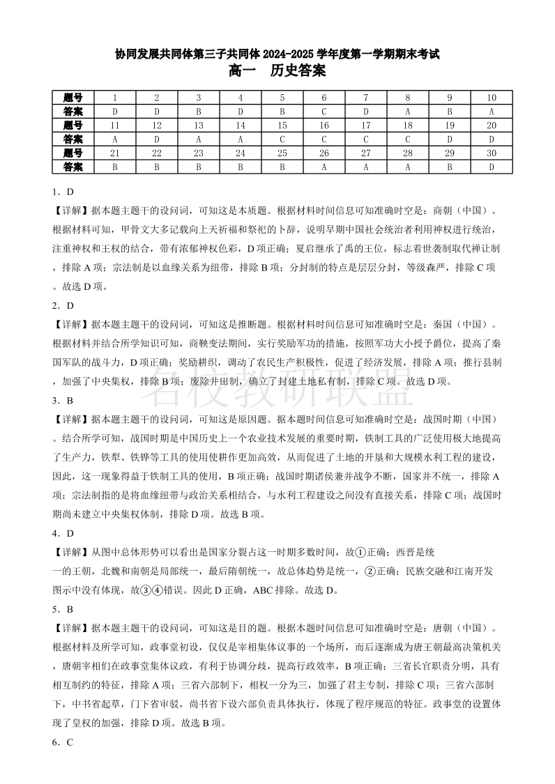 黑龙江省牡丹江市第三子共同体2024-2025学年高一上学期期末 历史答案.pdf