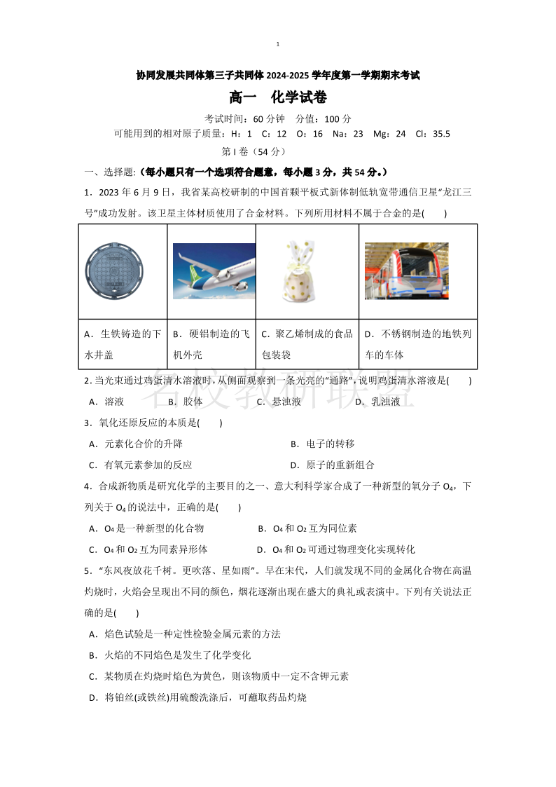 黑龙江省牡丹江市第三子共同体2024-2025学年高一上学期期末 化学(含答案).pdf