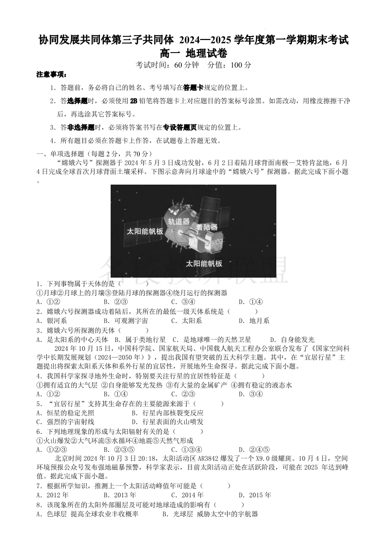黑龙江省牡丹江市第三子共同体2024-2025学年高一上学期期末 地理.pdf