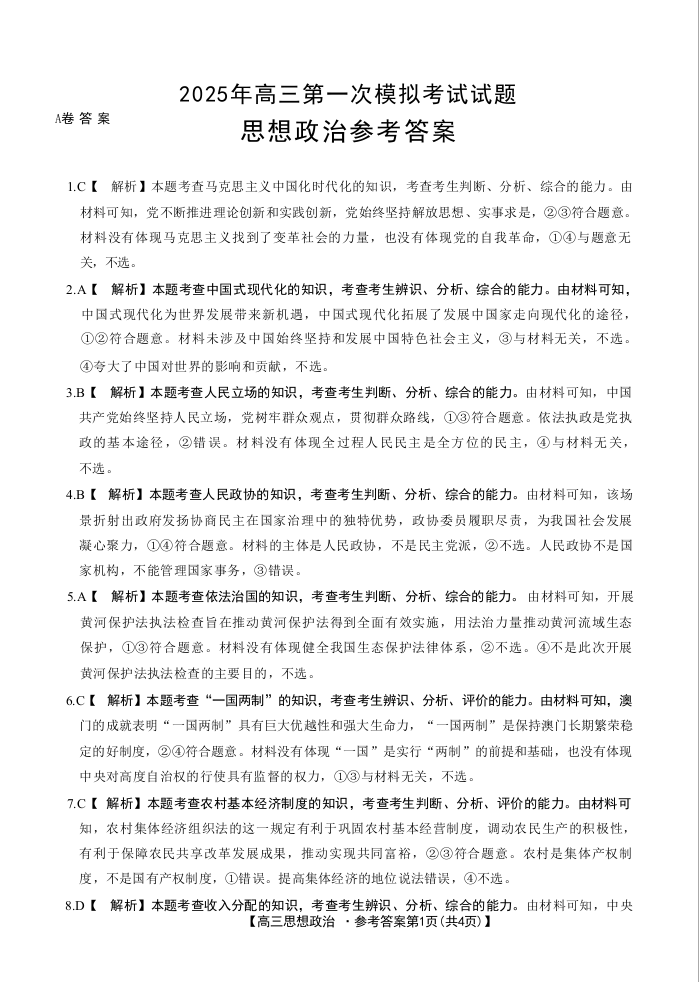 山西省晋城市2025年高三年级第一次模拟考试 政治答案.docx