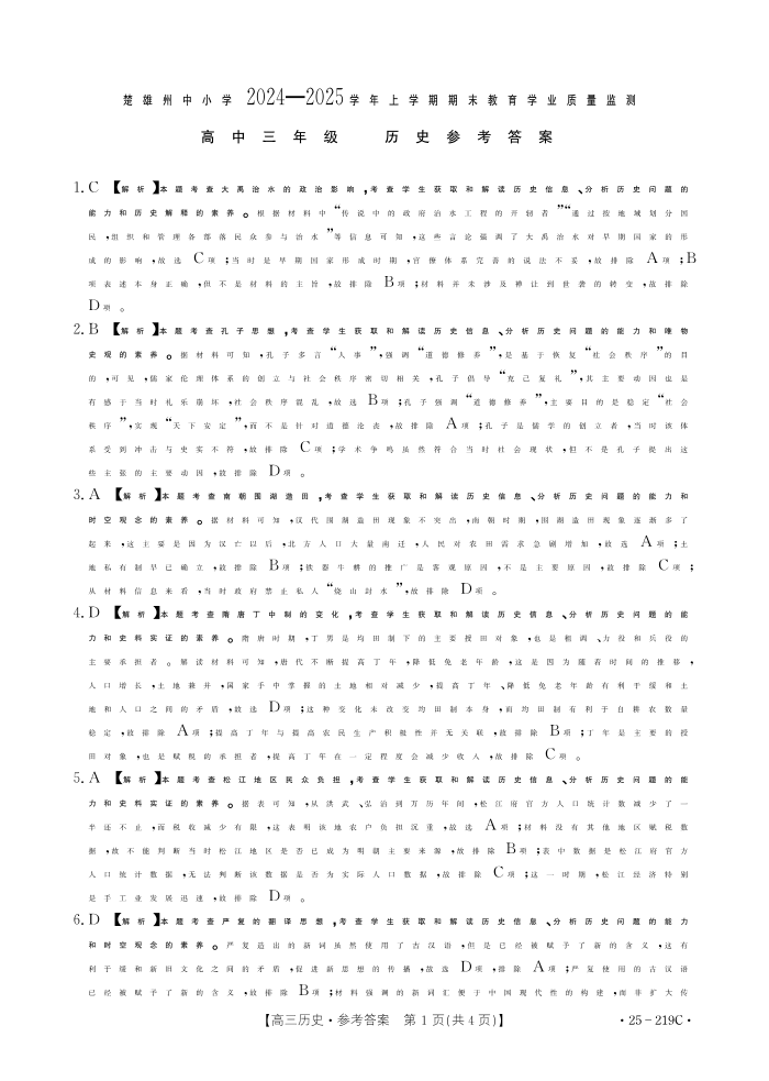 楚雄州2024-2025学年上学期期末教育学业质量监测高中三年级 历史参考答案.pdf