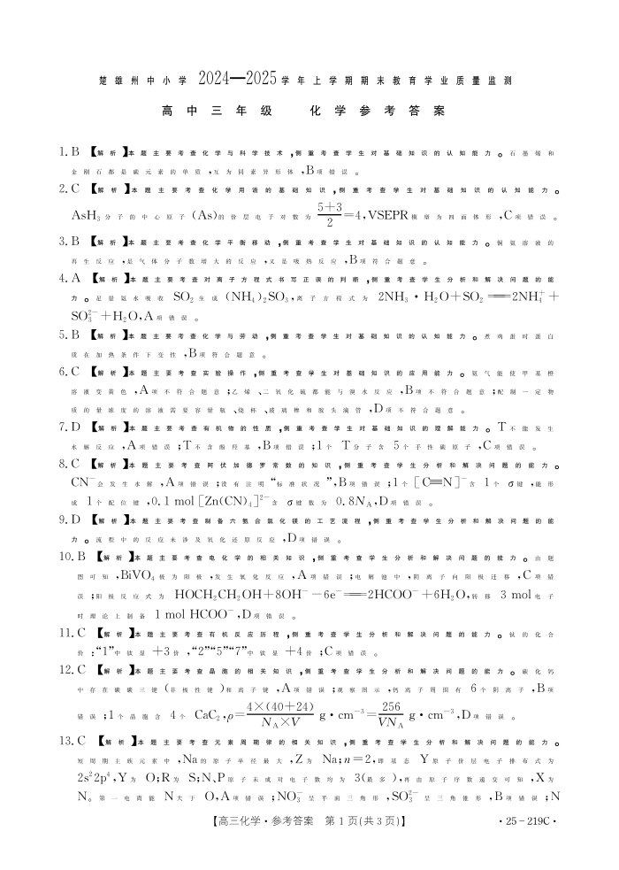 楚雄州2024-2025学年上学期期末教育学业质量监测高中三年级 化学参考答案.pdf