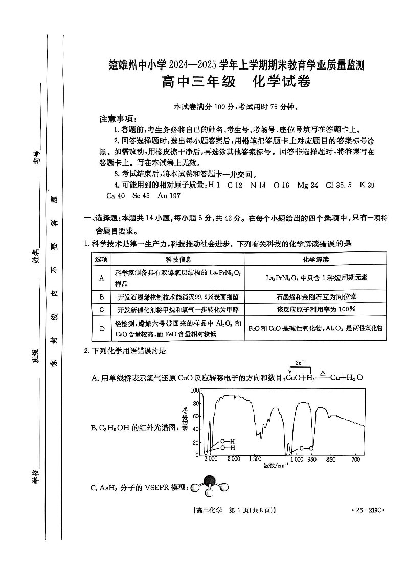 楚雄州2024-2025学年上学期期末教育学业质量监测高中三年级 化学.pdf