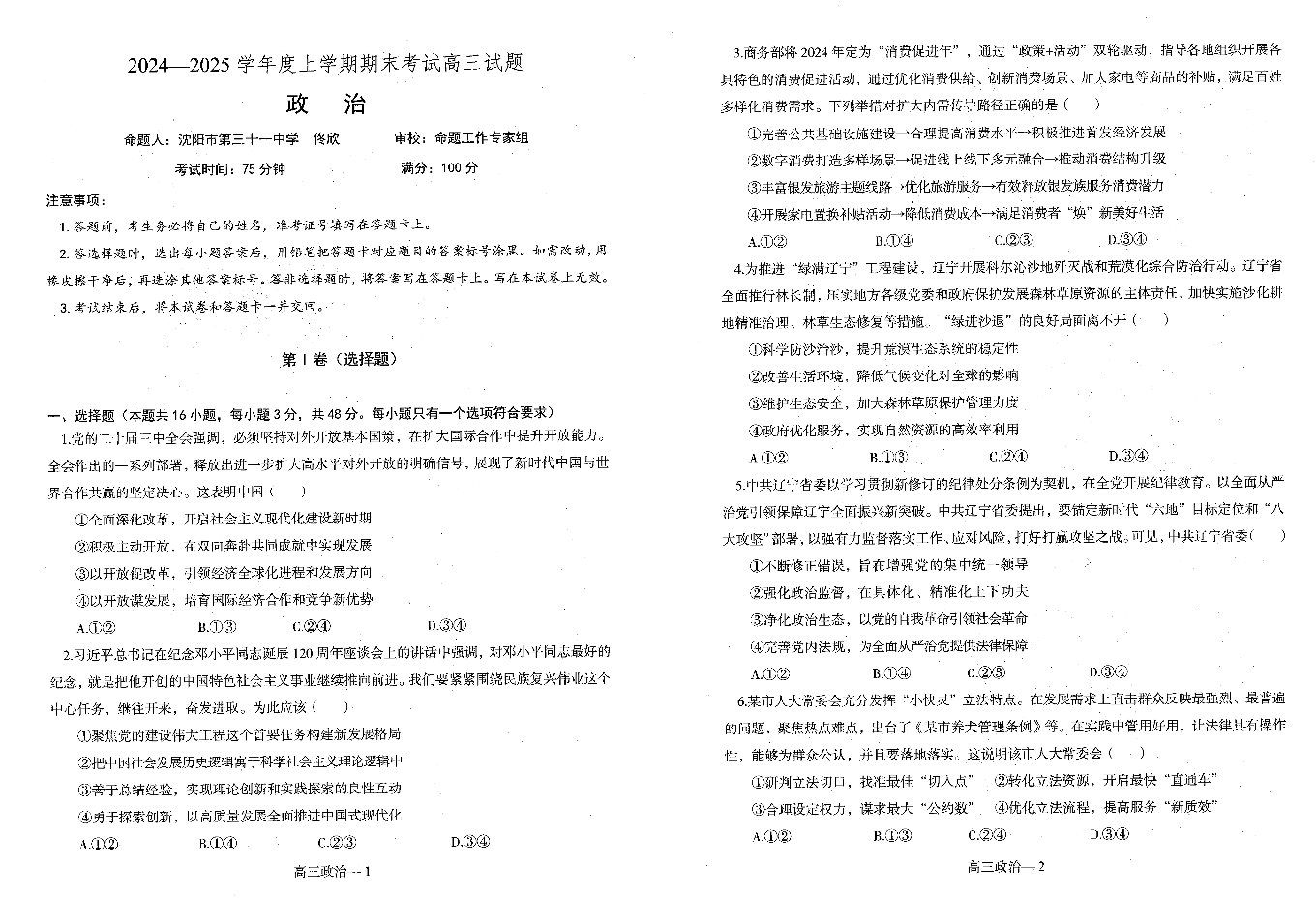 2024-2025上学期辽宁省重点中学协作校联考高三 政治.pdf