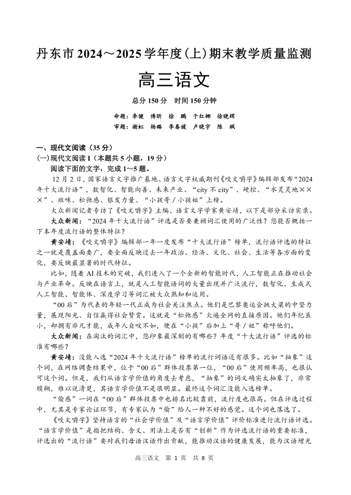 辽宁省丹东市2024-2025学年高三上学期期末教学质量调研测试 语文.pdf