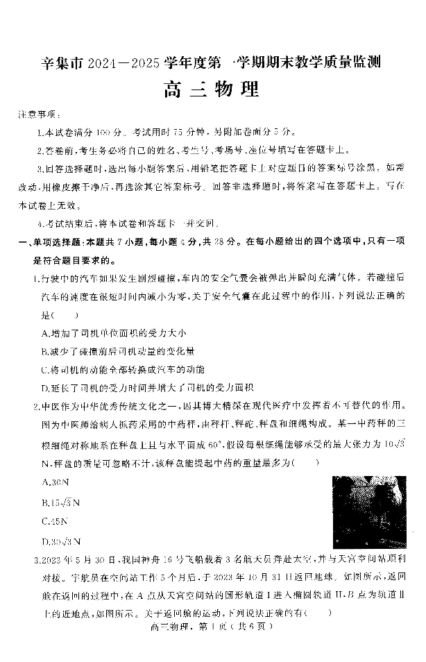 河北省石家庄市辛集市2025届高三上学期1月期末考试 物理.pdf