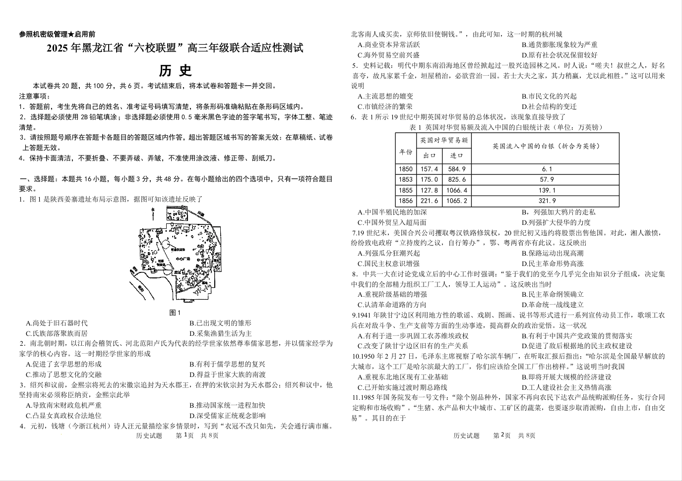黑龙江省“六校联盟”2025届高三上学期联合适应性考试 历史(含答案).docx