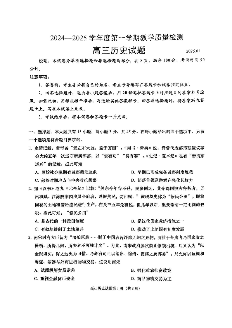 山东省青岛市2025届高三第一学期期末考试 历史(含答案).pdf