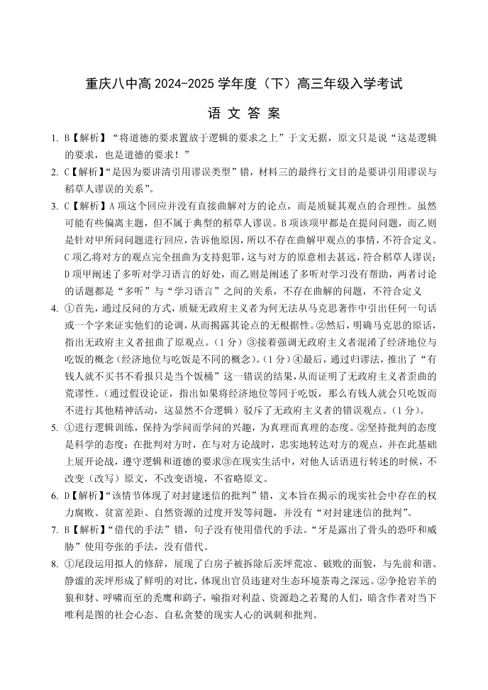 重庆市第八中学校2024-2025学年高三下学期入学适应性训练 语文答案.pdf