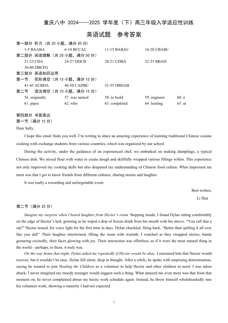 重庆市第八中学校2024-2025学年高三下学期入学适应性训练 英语答案.pdf