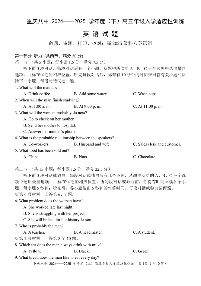 重庆市第八中学校2024-2025学年高三下学期入学适应性训练 英语.pdf