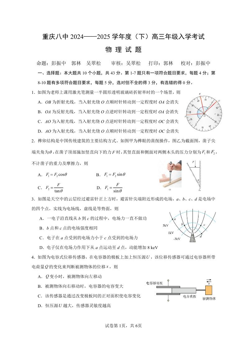 重庆市第八中学校2024-2025学年高三下学期入学适应性训练 物理.pdf