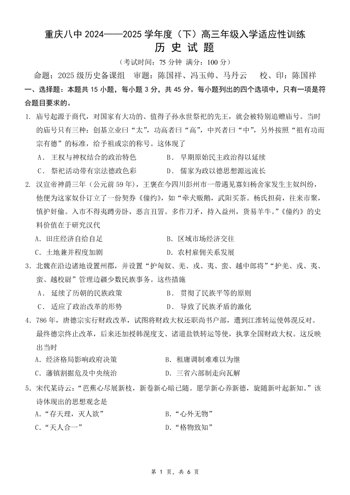 重庆市第八中学校2024-2025学年高三下学期入学适应性训练 历史.pdf