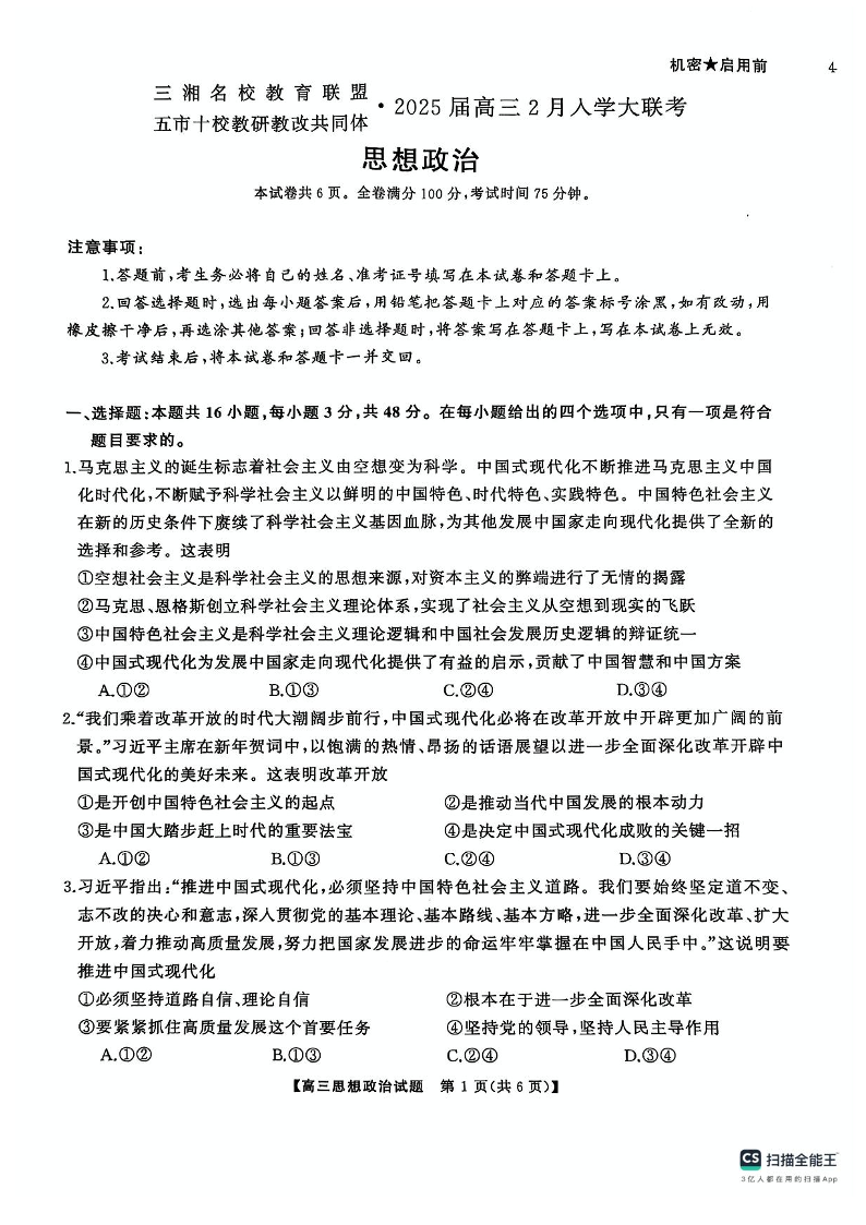 湖南省三湘名校教育联盟2025届高三2月入学大联考 政治.pdf