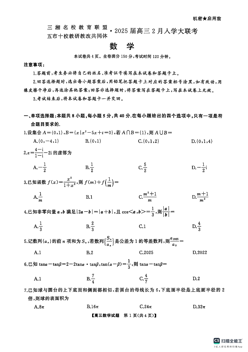 湖南省三湘名校教育联盟2025届高三2月入学大联考 数学.pdf