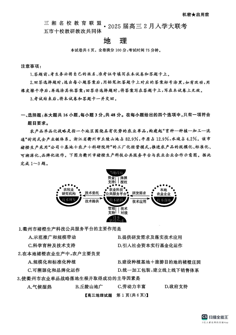 湖南省三湘名校教育联盟2025届高三2月入学大联考 地理.pdf