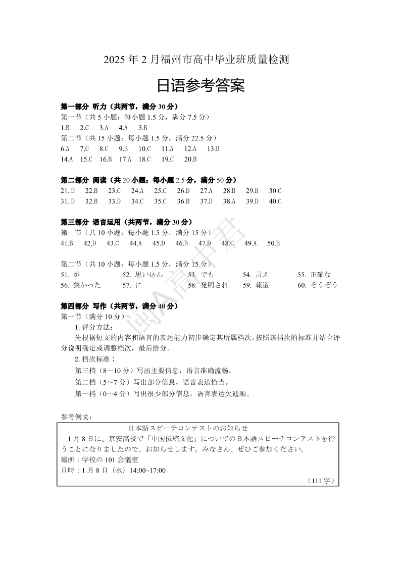 25年福州高三二检 日语答案.pdf