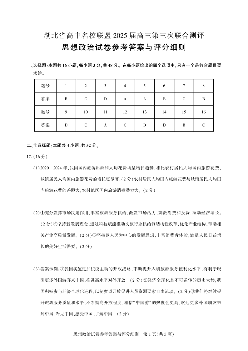 湖北省高中名校联盟2025届高三第三次联合测评 政治答案.pdf