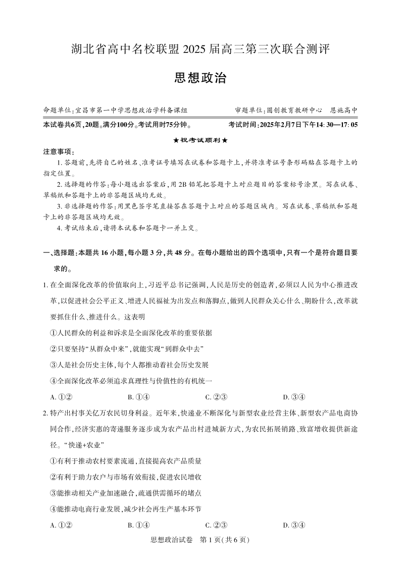 湖北省高中名校联盟2025届高三第三次联合测评 政治.pdf