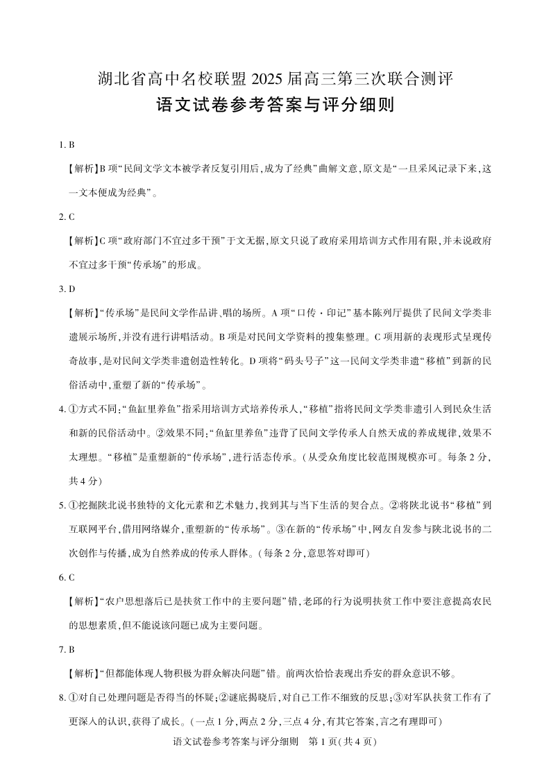 湖北省高中名校联盟2025届高三第三次联合测评 语文答案.pdf
