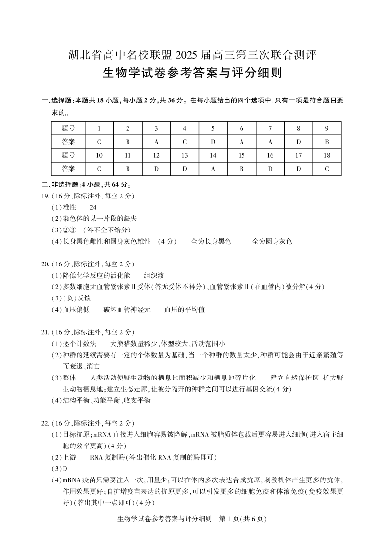 湖北省高中名校联盟2025届高三第三次联合测评 生物答案.pdf