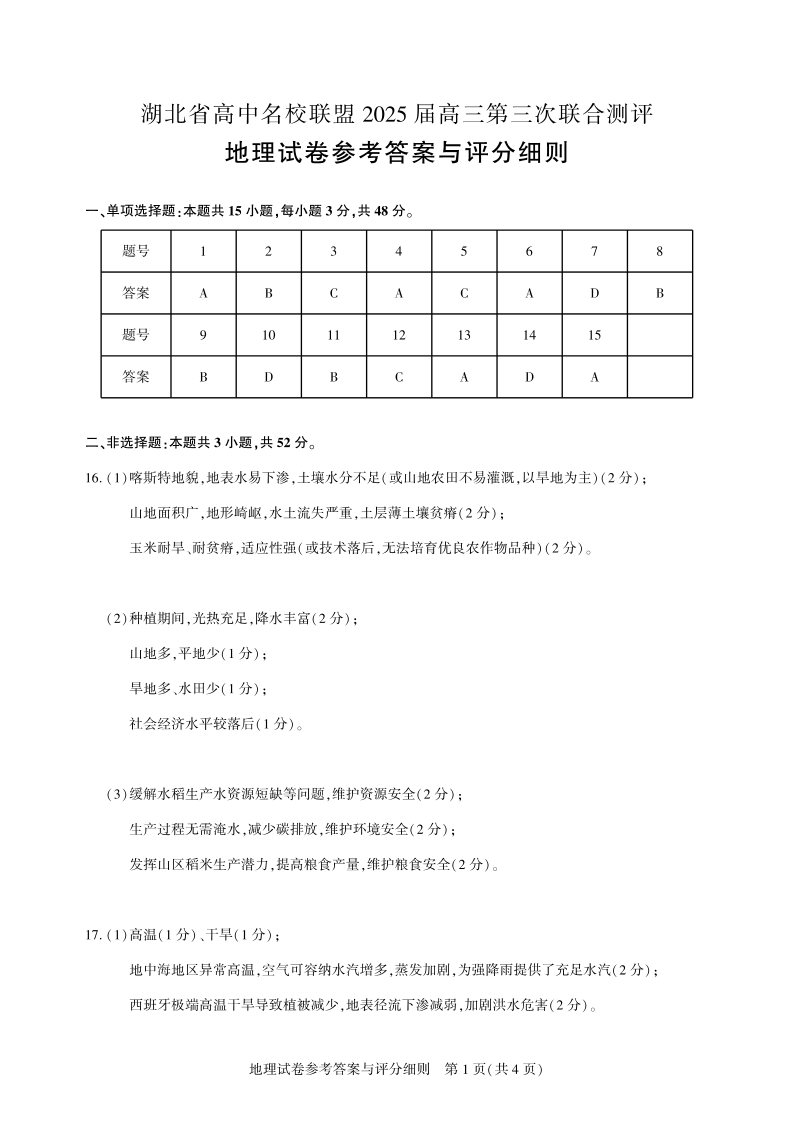 湖北省高中名校联盟2025届高三第三次联合测评 地理答案.pdf