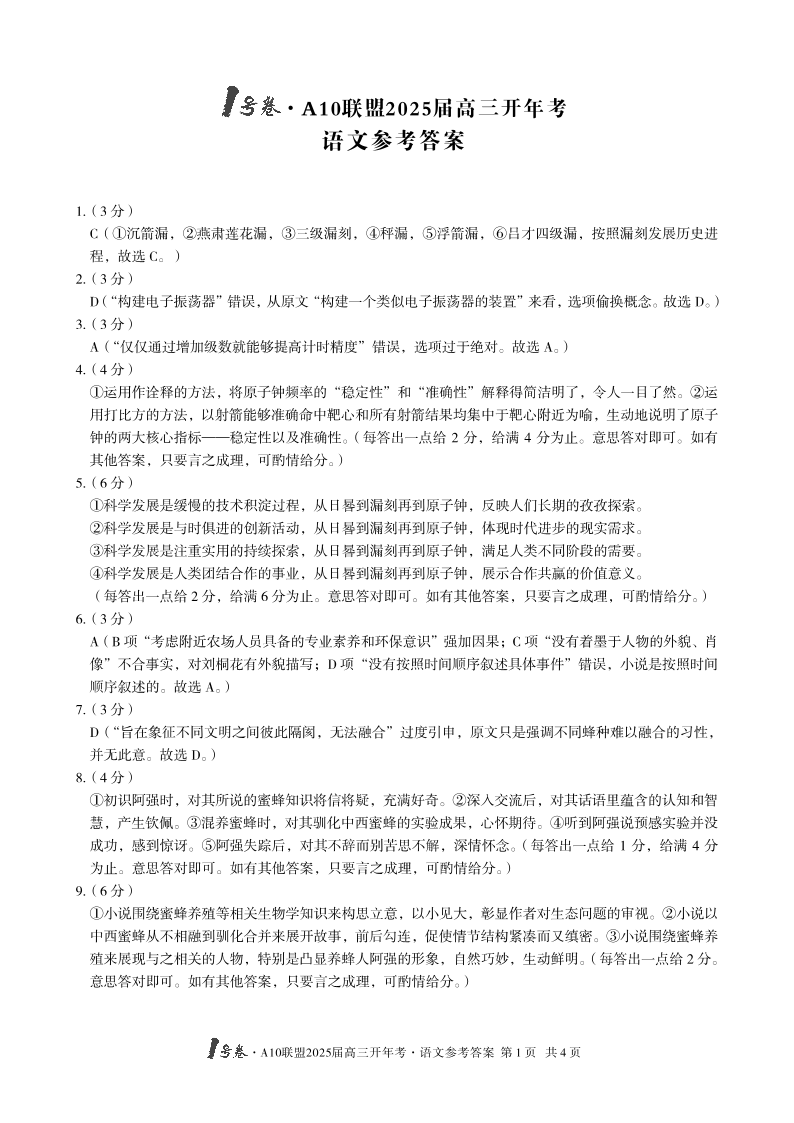 1号卷·A10联盟2025届高三开年考 语文答案.pdf