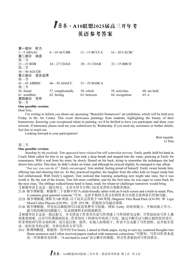 1号卷·A10联盟2025届高三开年考 英语答案.pdf