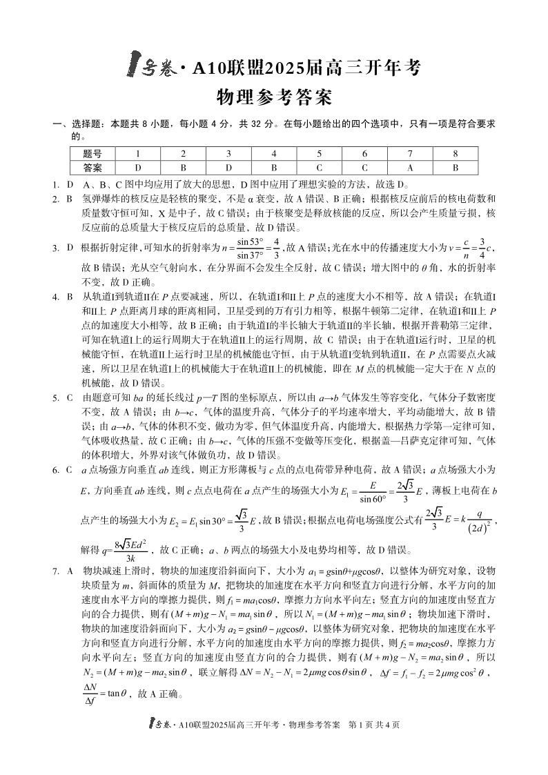 1号卷·A10联盟2025届高三开年考 物理答案.pdf