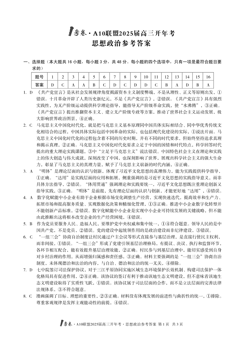 1号卷·A10联盟2025届高三开年考 思想政治答案.pdf