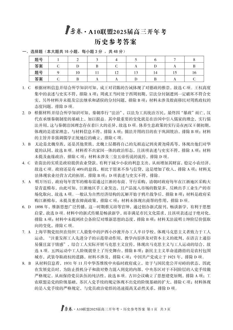 1号卷·A10联盟2025届高三开年考 历史答案.pdf