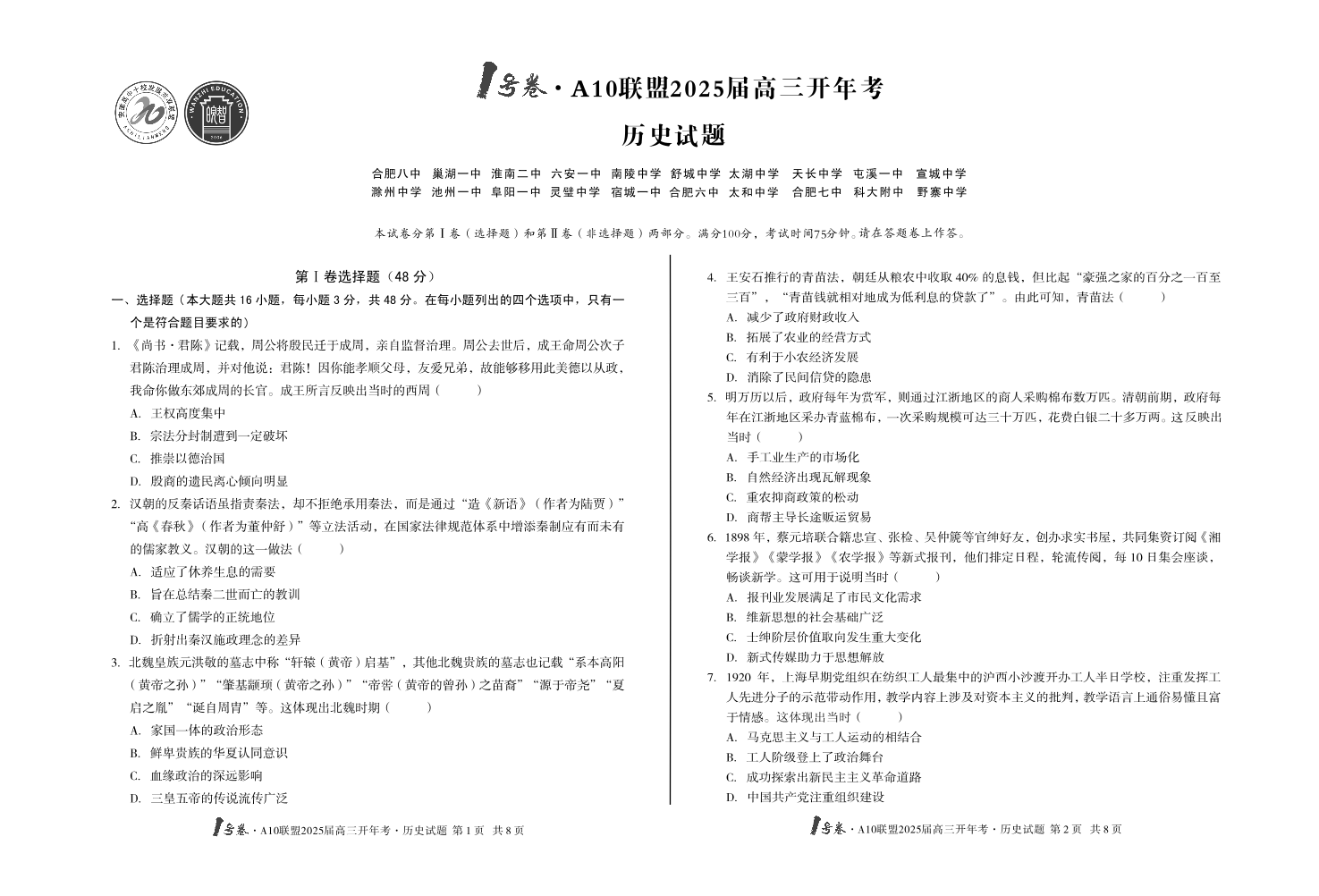 1号卷·A10联盟2025届高三开年考 历史.pdf
