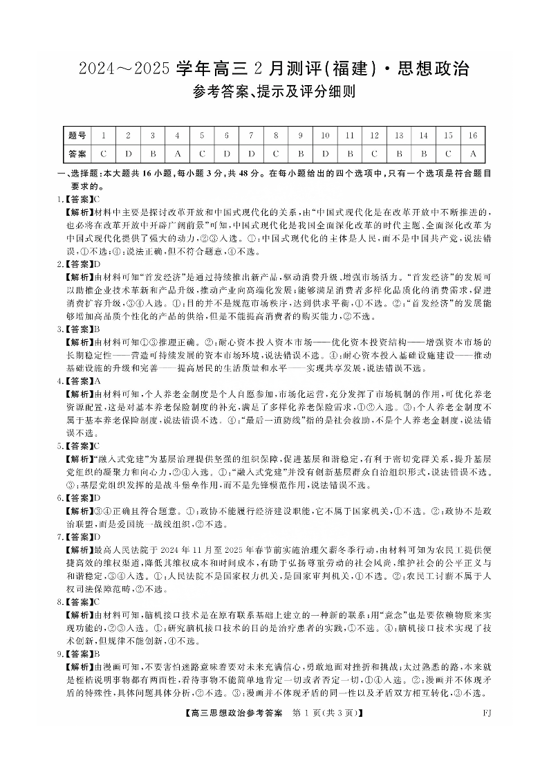 福建省百校联考暨金科大联考2024-2025学年高三二月测评 政治答案.pdf
