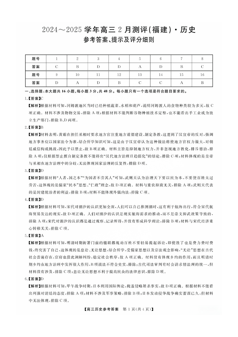 福建省百校联考暨金科大联考2024-2025学年高三二月测评 历史答案.pdf
