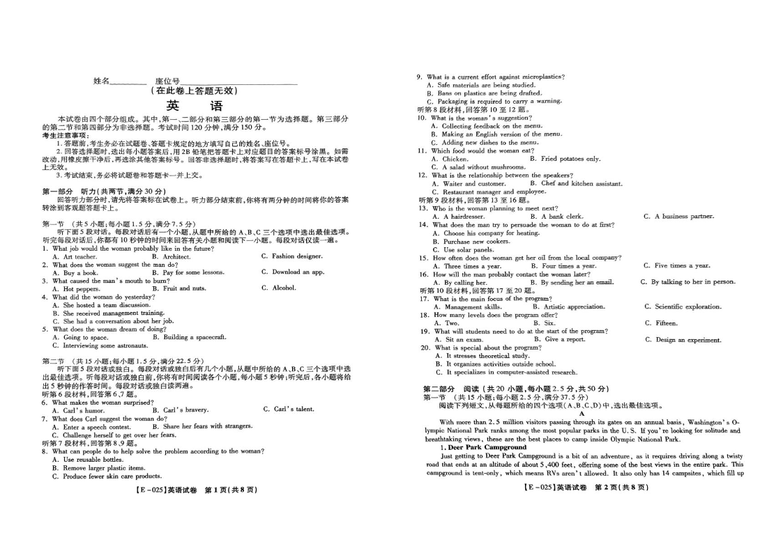 江西省九江十校2025届高三2月开学联考 英语.pdf