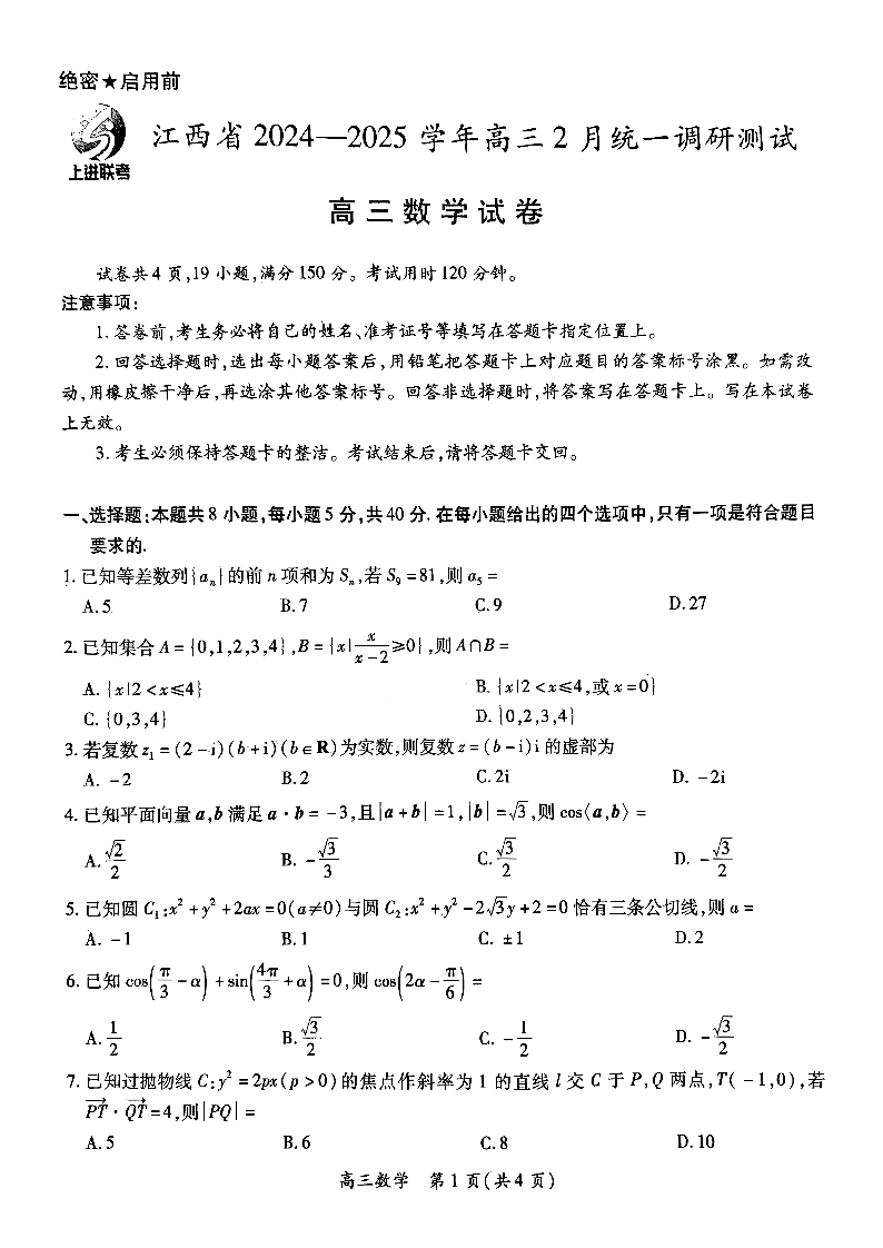 江西省上进联考2024-2025学年高三2月统一调研测试 数学.pdf