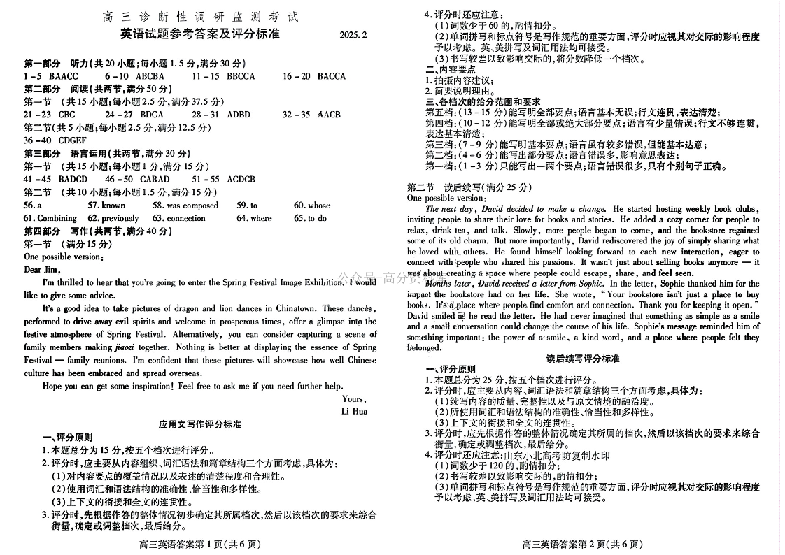 山东省潍坊市2025届高三2月开年诊断调研监测考试 英语答案.pdf