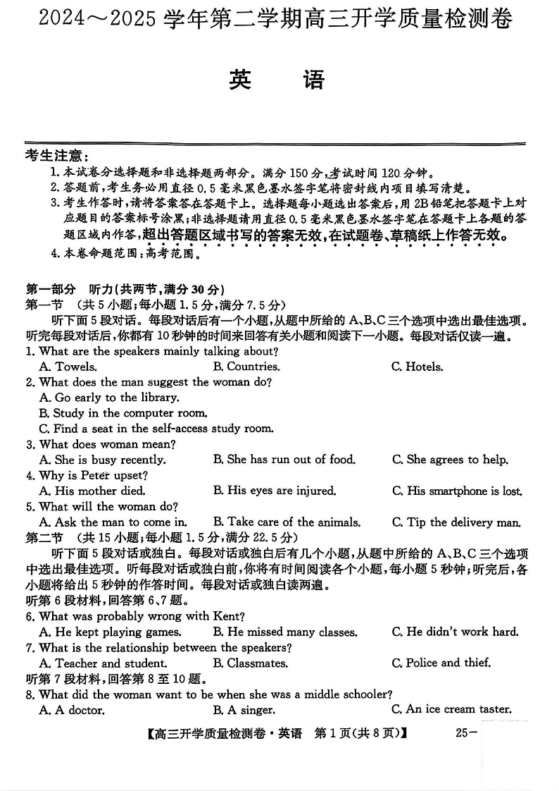 山西省卓越联盟2024-2025学年高三下学期2月开学质量检测 英语.pdf