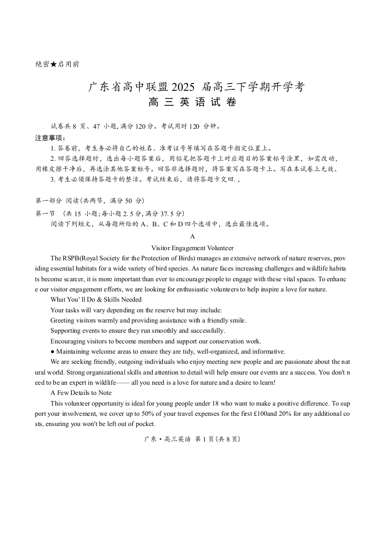 广东省领航高中联盟2025届高三下学期开学考 英语.pdf