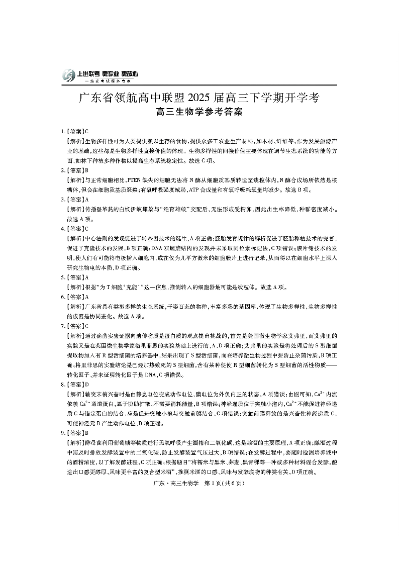 广东省领航高中联盟2025届高三下学期开学考 生物答案.pdf