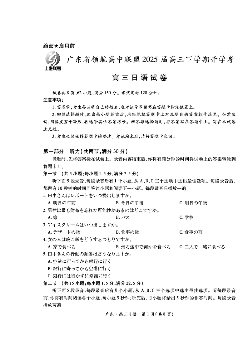 广东省领航高中联盟2025届高三下学期开学考 日语.pdf