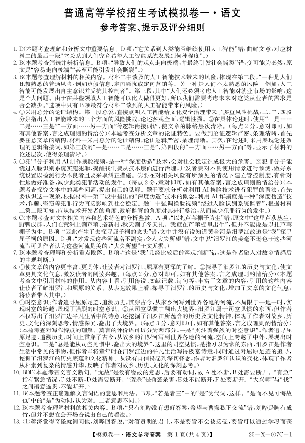 河南省新高中创新联盟2025届高三模拟卷一 语文答案.pdf